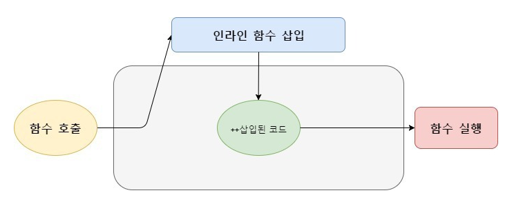 이러한 경우를 대비하기 위해 인라인 함수를 활용할 수 있다. 인라인 함수는 호출될 때 일반적인 함수의 호출 과정을 거치지 않고, 함수의 모든 코드를 호출된 자리에 바로 삽입하는 방식의 함수이다. 이 방식은 함수를 호출하는 데 걸리는 시간은 절약되지만 함수 호출 과정으로 생기는 여러 이점을 포기해야 한다. 따라서 코드가 적은 함수일 때만 인라인 함수로 선언하는 것이 좋다.
